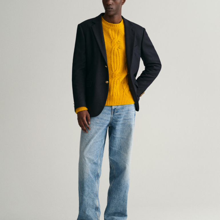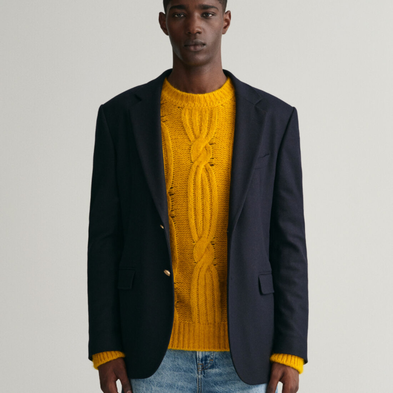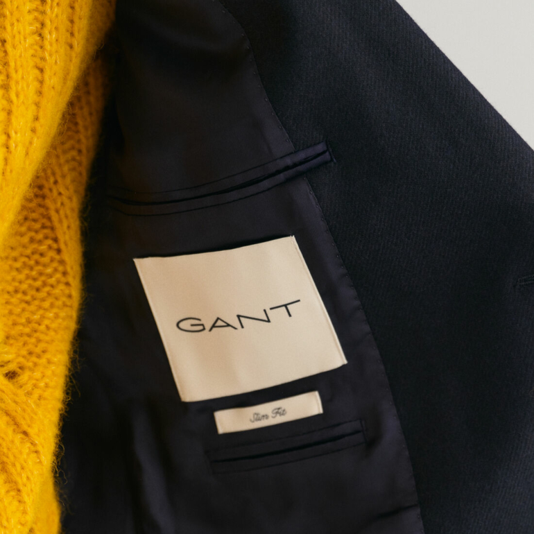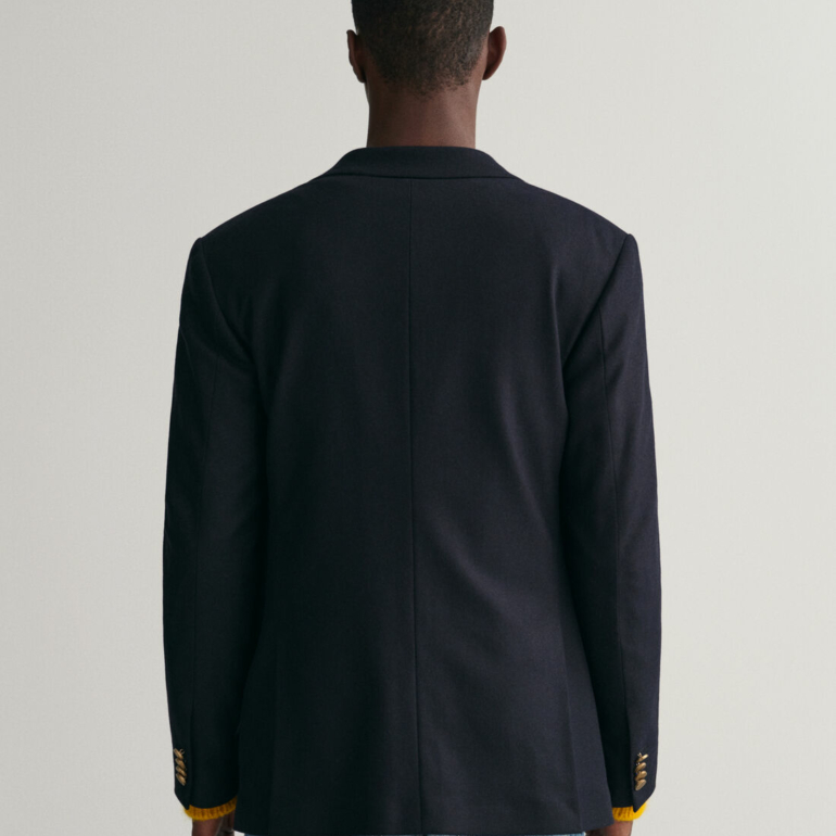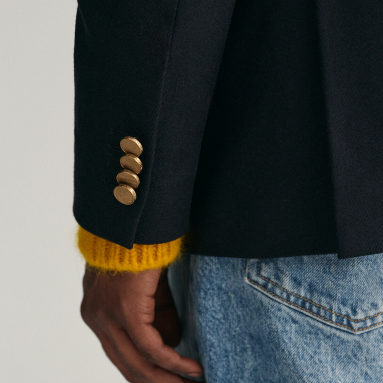 Inspiré de l’esthétique sportswear américaine, ce blazer club est un essentiel de toute garde-robe preppy. Confectionnée pour une coupe ajustée et une finition au niveau des hanches, cette pièce est confectionnée dans un mélange de laine italienne de première qualité pour un toucher doux. Il présente une silhouette à boutonnage simple, un revers cranté, une seule poche passepoilée sur la poitrine et des poches latérales à rabat. Le design est complété par des boutons de la marque GANT pour des détails rehaussés.